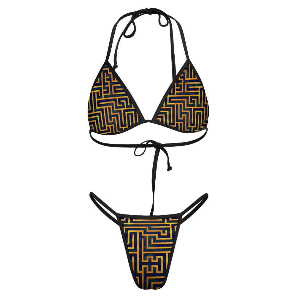 The Inaya Micro Bikini is designed for women who embrace boldness and heritage. With its striking maze-like geometric print in gold and deep navy, contrasted with sleek black trims, Inaya makes a powerful statement—perfect for sun-drenched beaches or chic poolside lounging.