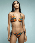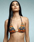 The AMANY bikini is a bold piece that embodies freedom and confidence. Its vibrant zigzag print in orange, black, turquoise, and gold enhances the silhouette and catches the light, while sleek black trims add a refined, timeless touch.